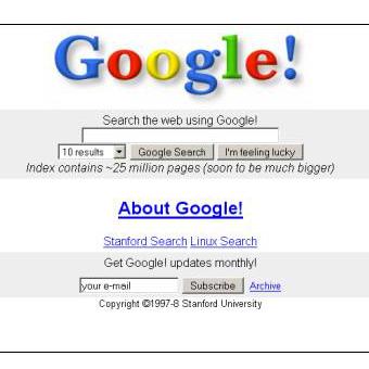 Tampilan Google di tahun 1998"Kami ingin memberi Anda dan teman-teman maupun koneksi Anda, informasi yang paling berguna," ujar Google dalam pernyataannya. "Rekomendasi dari orang yang Anda kenal benar-benar dapat membantu. Jadi teman-teman Anda, keluarga, dan orang lain dapat melihat nama, profil, foto, dan ulasan tentang Anda, ataupun iklan yang Anda sukai," lanjut pernyataan itu.